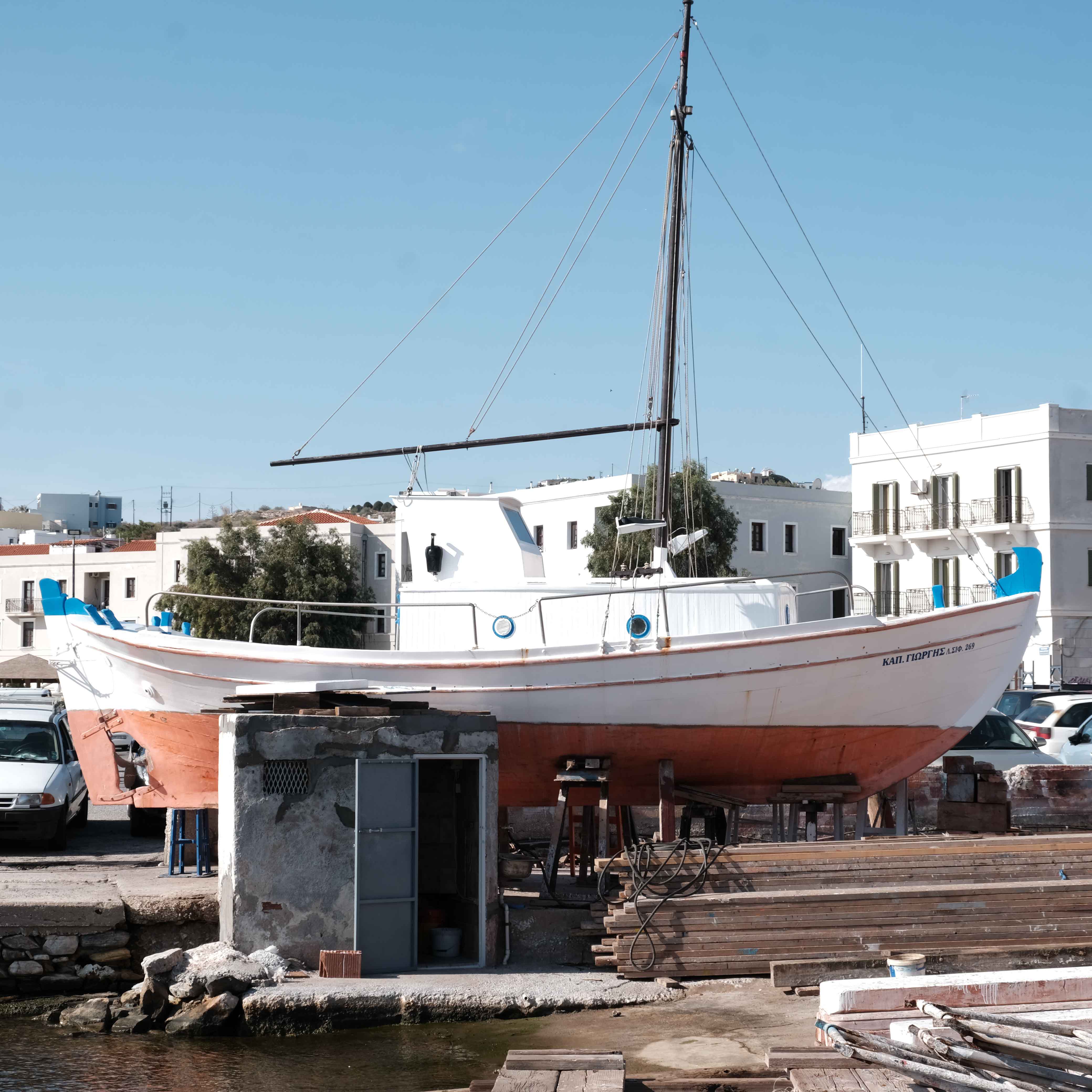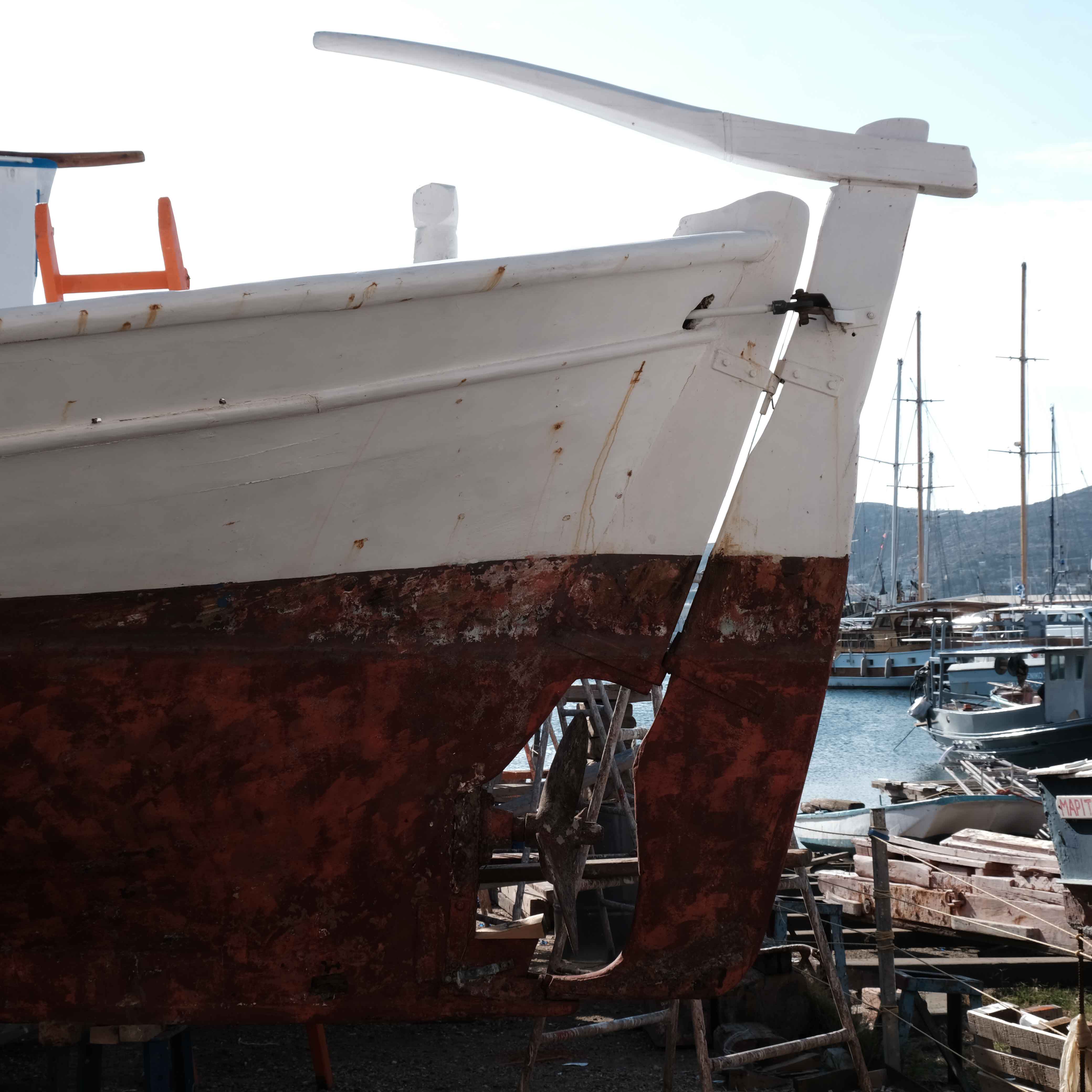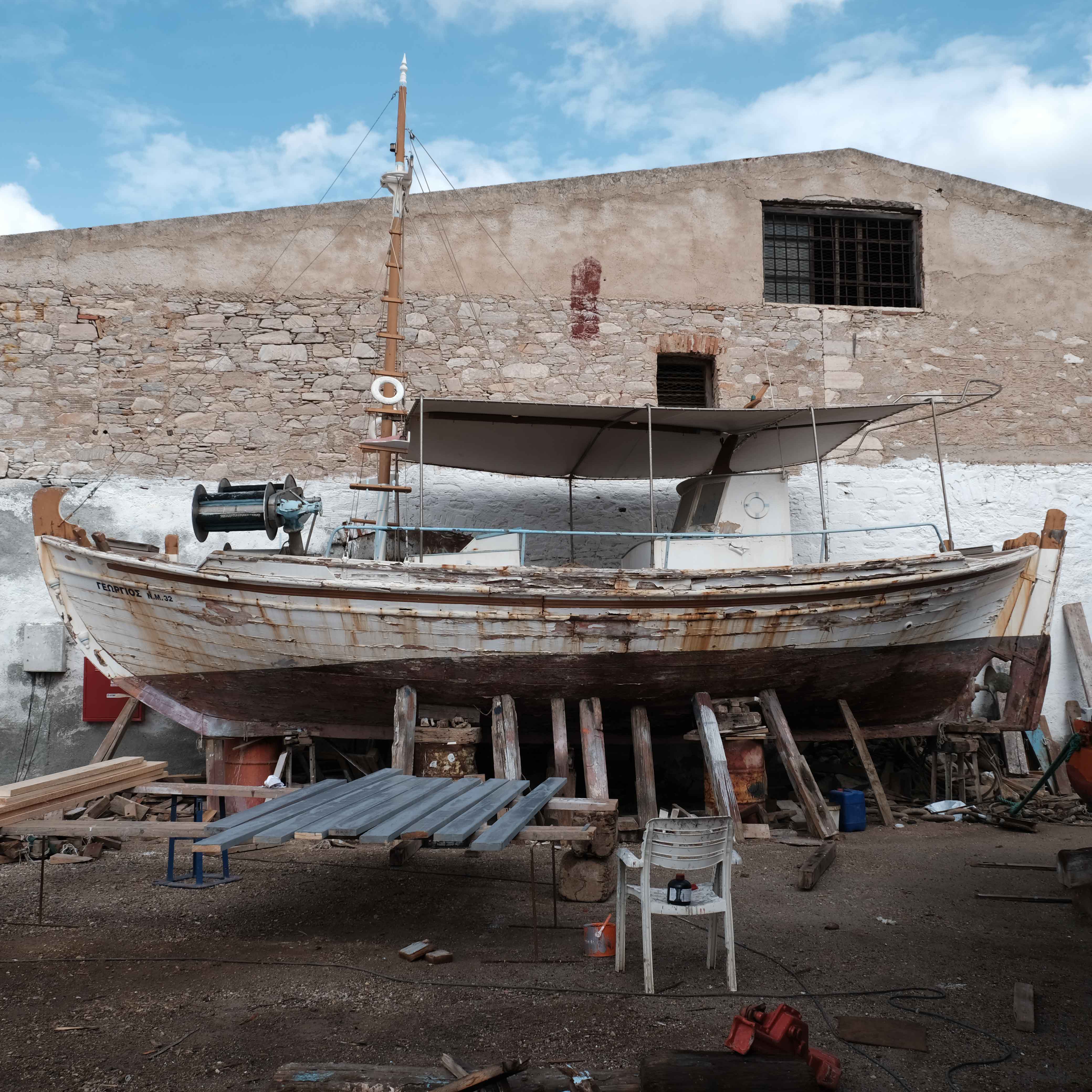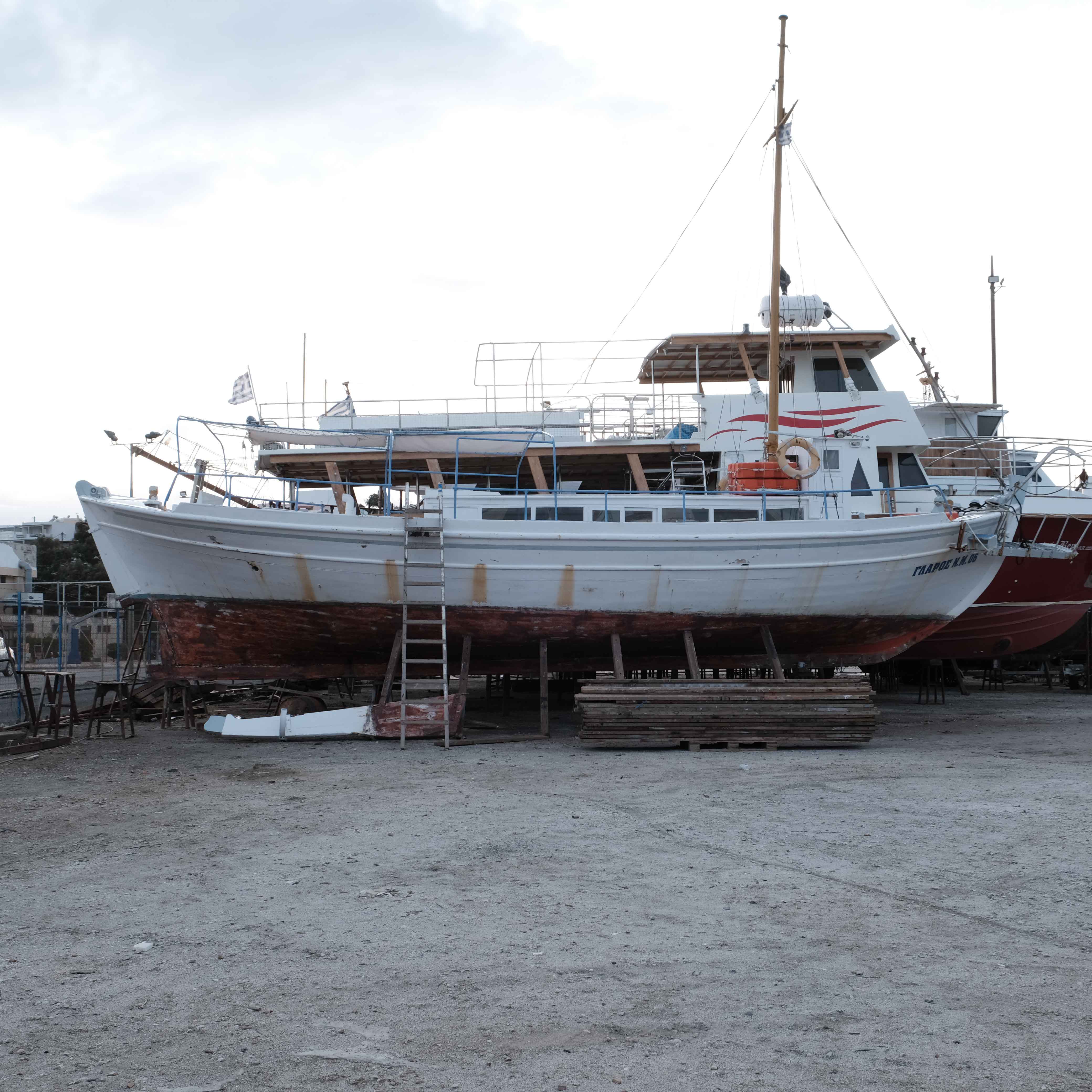 For five generations, the Polidoulis family has upheld the tradition of maintenance and caulking of wooden boats; drydocked boats, winches, and a wooden slipway form a portrait of the yard’s daily activity.