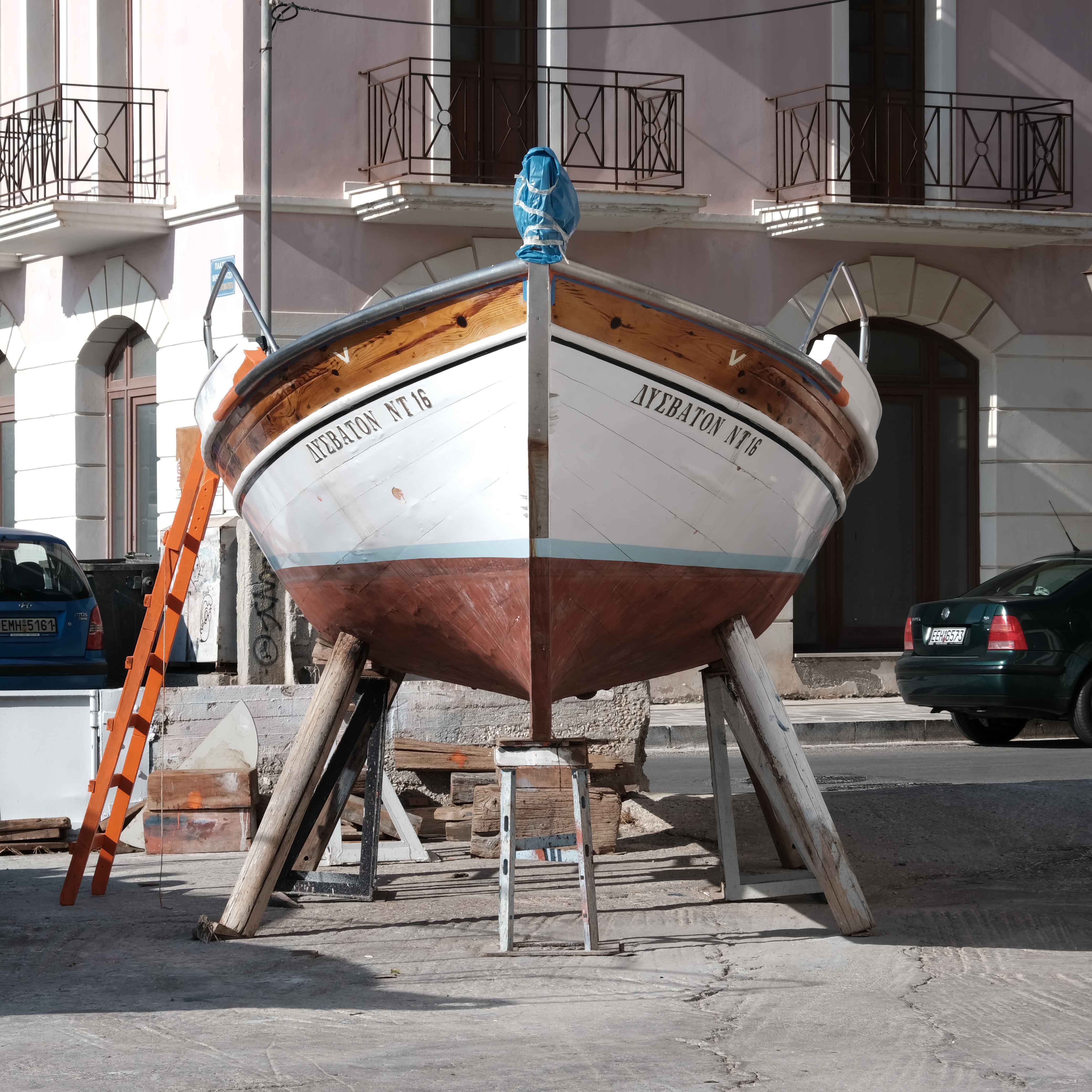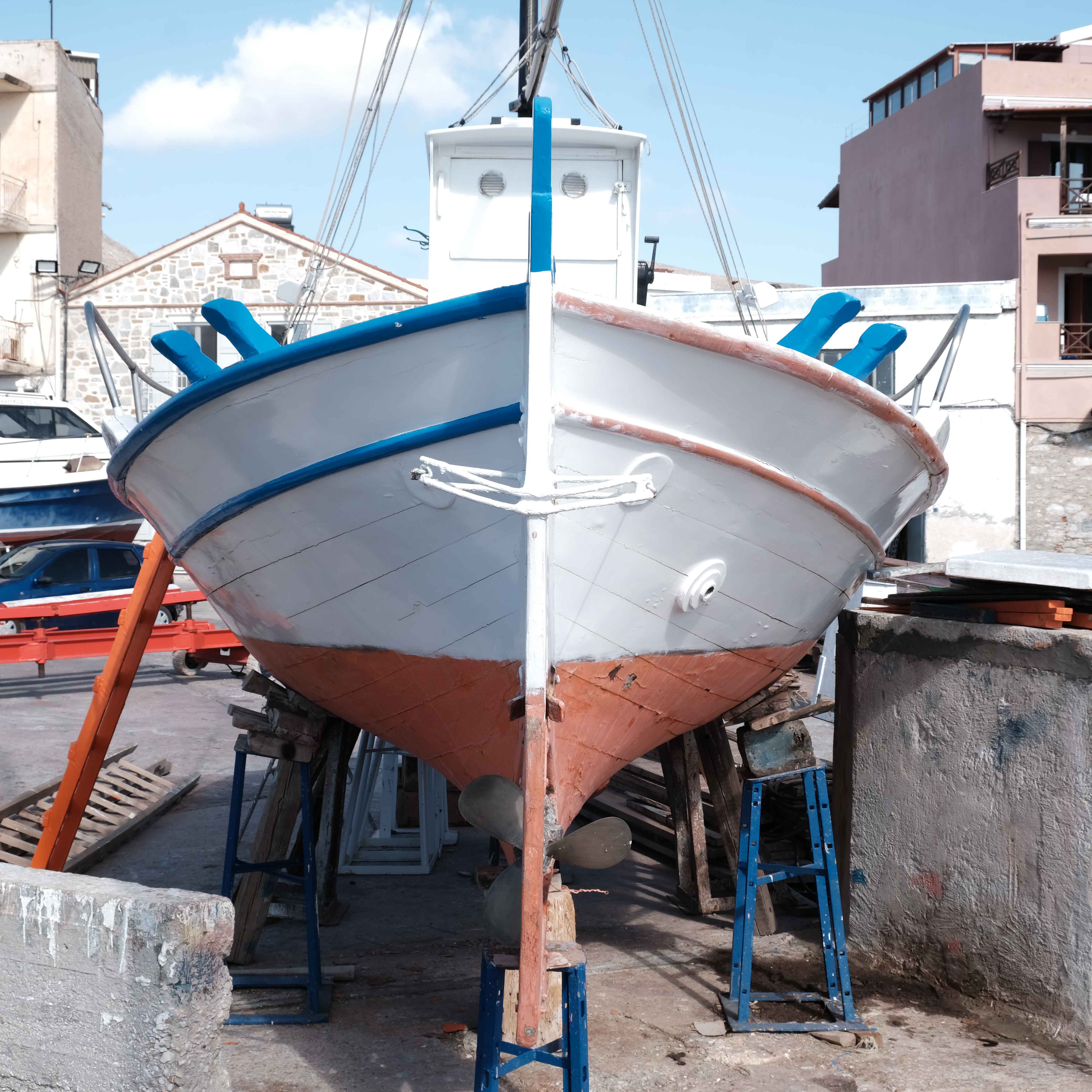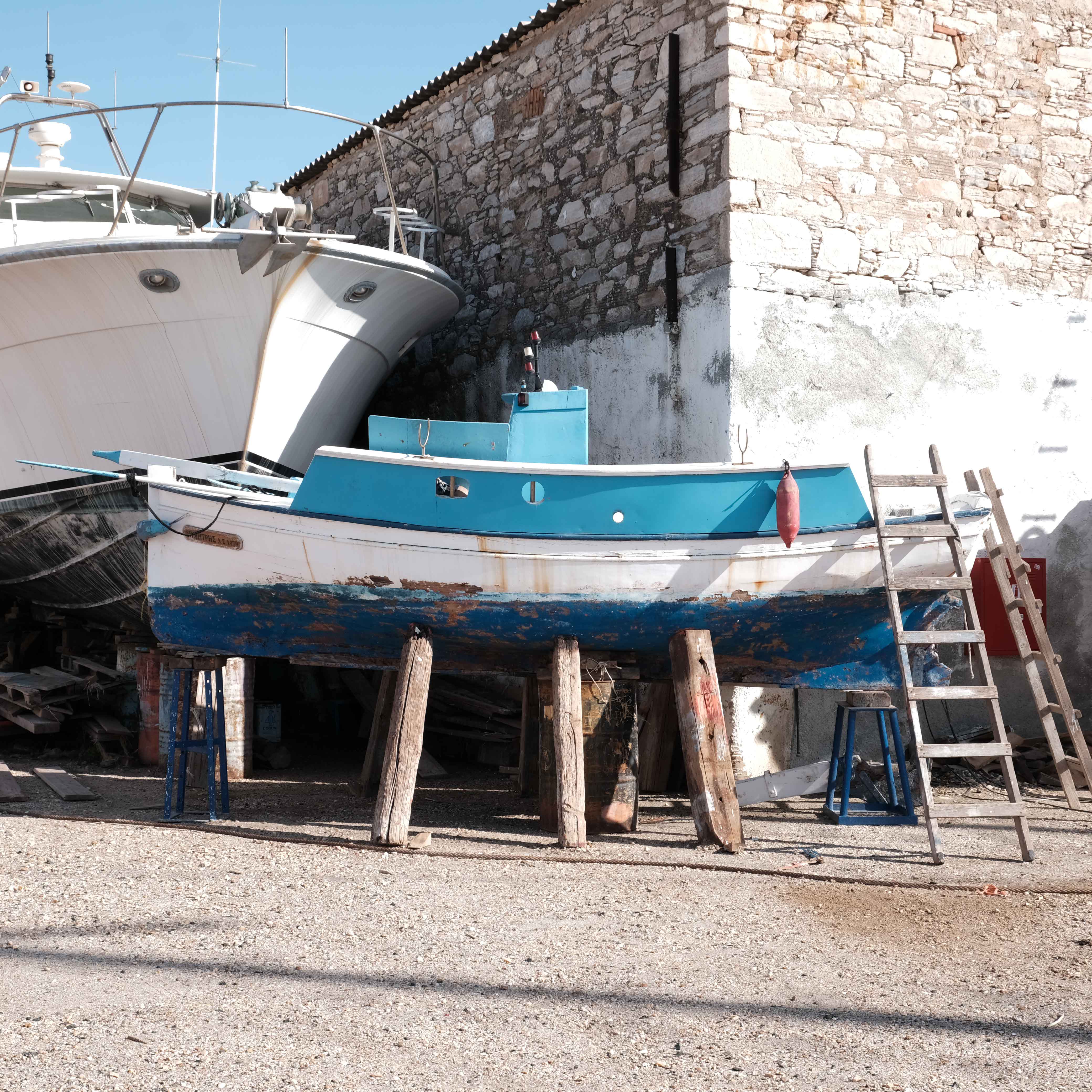 For five generations, the Polidoulis family has upheld the tradition of maintenance and caulking of wooden boats; drydocked boats, winches, and a wooden slipway form a portrait of the yard’s daily activity.